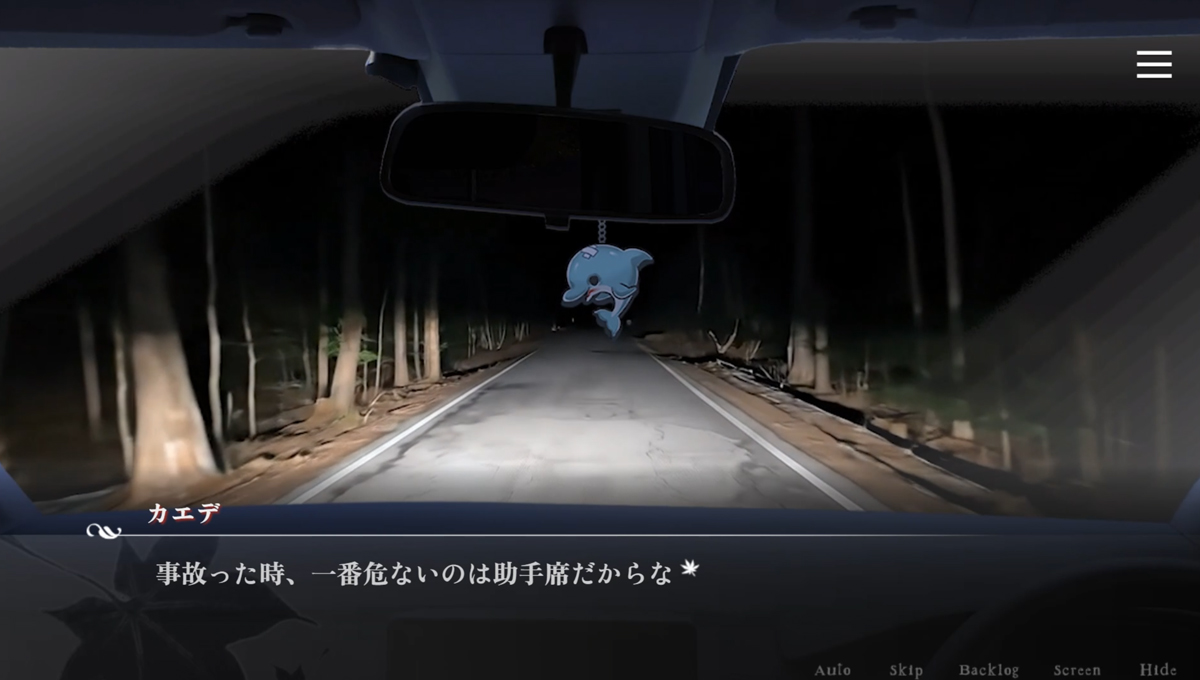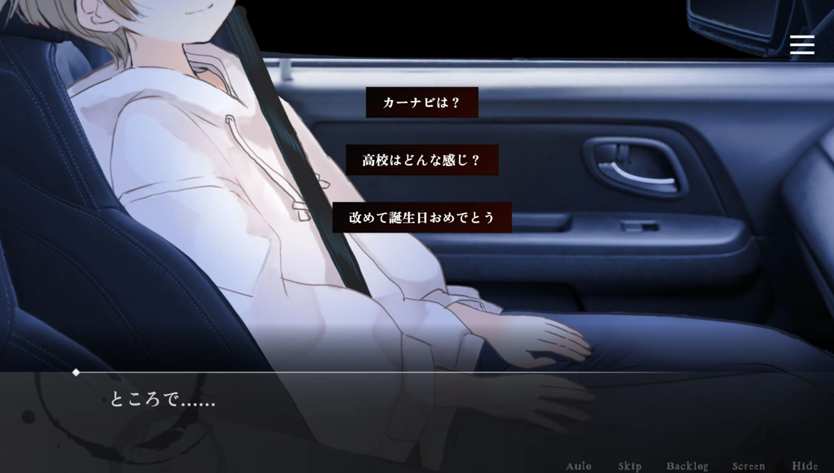 中学を卒業して以来連絡をとっていなかった幼馴染に誘われ、 あなたは深夜のドライブに出かけます。 彼との雑談を繰り返していく中で、あなたは幼馴染が隠している何かに 気づけるでしょうか…?