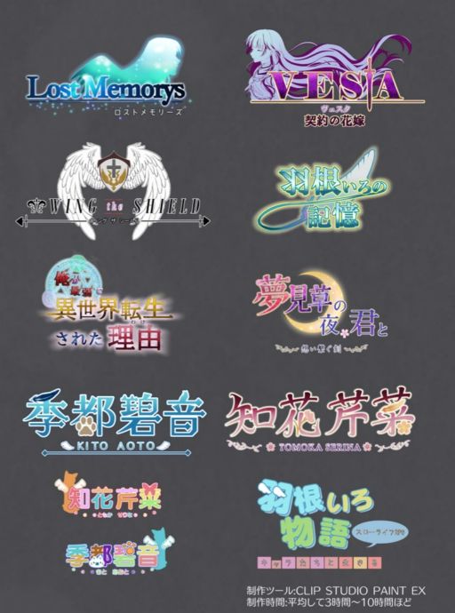 私が作成したロゴの一部です。 RPGのタイトルロゴ、サークルロゴ、ネームロゴなど幅広く手掛けております。 どのような作品(または人物、サークル)なのかが伝わるように、を一番に考えております。 また、視認性も大切にして作成しております。