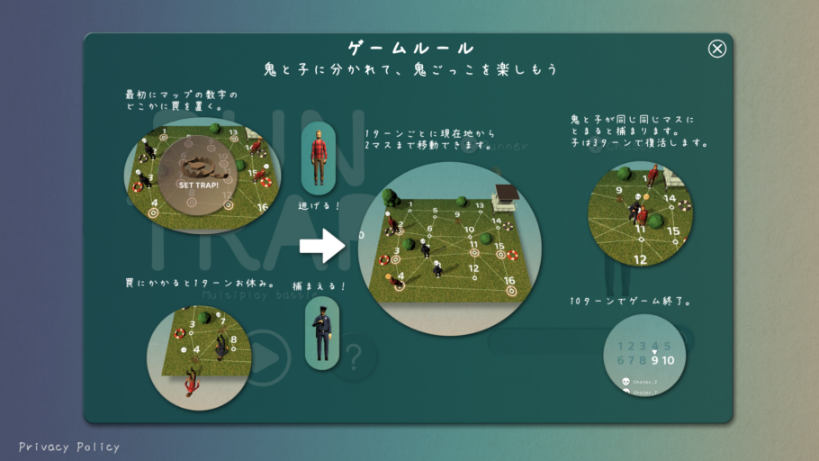簡単で奥深い、鬼ごっこゲーム。 RunTrapは2人の鬼役と2人の子役に分かれて遊ぶ鬼ごっこゲームです。 ■共作 @g-blossomさん https://game-creators.camp/@g-blossom @kenei_designさん https://game-creators.camp/@kenei_design ■ストア iOS: https://apps.apple.com/app/id1508482772 Android: https://play.google.com/store/apps/details?id=com.boxcreation.runtrap
