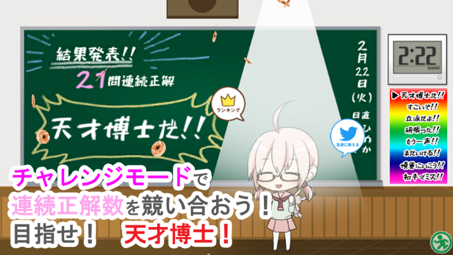 オリジナルキャラクター×クイズゲーム×ノベルゲームのオリジナルゲーム 『学園スイーツ発見 ~双目のドーナツ編~』の制作を主体となって行いました。 ■ゲームURL 【unityroom(無料)】https://unityroom.com/games/schoolsweetswatch イラストレーター・デザイナーに平和なべ、 声優に和泉沙依、菜月なこの2名を起用し、 絵や音についても主要なものは全編新規素材を用いて約10日で制作しています。 ■共同制作者について ・平和なべ(https://twitter.com/hf_heiwanabe ) 絵本付きCD『ほかのくにではなんてーの?』(ポニーキャニオン)等 ・和泉沙依(https://twitter.com/sayoyoyo0719 ) 『古の女神と宝石の射手』(YW GAME(HK) LIMITED)アテナ等 ・菜月なこ(https://game-creators.camp/@nutsnaco ) 『ふたりに本気で恋したい』(スタジオルナ)杉浦加奈等 菜月様につきましては、当サイト経由でのご縁がありました。 ■制作部分 使用ツール:unity,宴,photoshop,Excel等 企画、シナリオ、実装については概ねすべて担当しました。 ランキング機能、ツイート機能、一部画像(国旗)、BGM、ノベルゲームの基礎、フォントに関しては公開パッケージやアセット、フリー素材等を利用しています。 ボイス、イラストに関しては先述の3名に発注。 部分的に画像素材を自作している部分もございます。 制作に関する詳細は、メイキング記事としてまとめています。 ●Unity 1週間ゲームジャム お題「2」に参加したメイキング【学園スイーツ発見 双目のドーナツ編】(note) https://note.com/m_hanakura/n/nac3f7176004b ■評価 「Unity1週間ゲームジャム(お題「2」)」というゲームジャム参加したタイトルのため、各指標について評価が出ています。 参加タイトル全343作品中、以下の指標でランク入りを果たしています。 全体として高評価を頂いております。 ------------------- 総合37位 絵作り7位 サウンド11位 操作性38位 雰囲気37位 ------------------- ●Unity1週間ゲームジャム(お題「2」)ページ https://unityroom.com/unity1weeks/52 ●評価についての振り返り記事 unity1weekの結果発表を受けての振り返り『【クイズ】学園スイーツ発見 ~双目(ざらめ)のドーナツ編~』(note) https://note.com/m_hanakura/n/neb87f3f90252 ■広報 ゲームの制作と並行してプロモーションビデオの制作を行いゲームと同時に公開する、公開後早い時期にメイキングの記事を公開する、ウェブページを制作するなど、露出を意識した活動を行いました。 HP:https://duckplanning.wixsite.com/mysite/schoolsweetswatch PV1:https://www.youtube.com/watch?v=KMQ4BB4Qpz0 PV2:https://www.youtube.com/watch?v=btNMtPcnvy8