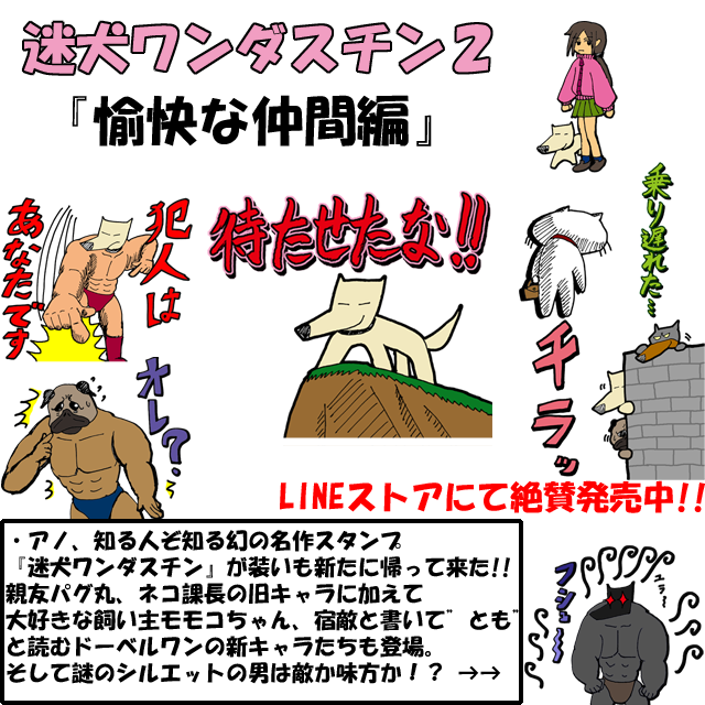 LINEスタンプ 『迷犬ワンダスチン2』 解説: ワンダスチンスタンプの第二弾。 カワイイ女の子を描いてみたいと思ってワンダスチンの飼い主を描いたけど 全然可愛くない上に、どう使っていいか分からないスタンプ柄になってしまった苦い思い出が蘇ります。 【集合】のスタンプは勇者ジャナイの召喚魔法にも使用されました。リサイクルおつ!! 気になった方は今すぐ下記アドレスからストアへ GO!! http://line.me/S/sticker/1178529