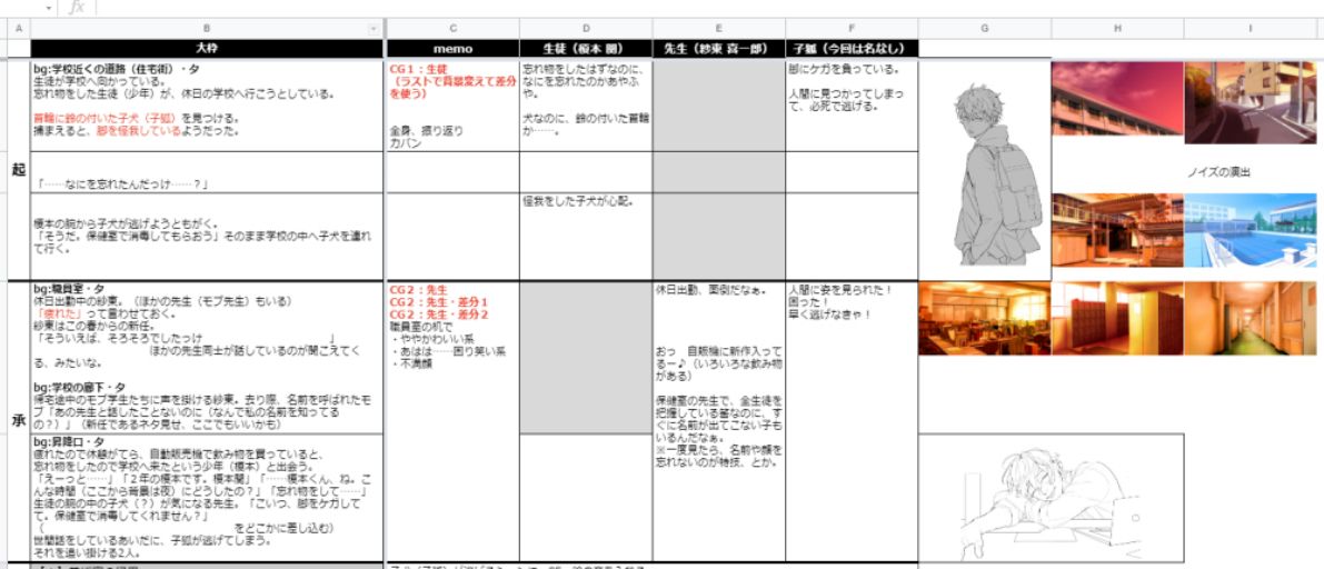 ある週末の夕方、高校生「榎本 関(えのもと・とおる)」は、学校に忘れ物をしたことに気づいた。 学校へ向かっていると、脚を怪我した子犬を見付ける。しかし怖がらせてしまったのか子犬は逃げ出し、学園の敷地内へ迷い込んでしまった。 榎本が校内をうろついていると、保健室の養護教諭「紗東 喜一郎(さとう・きいちろう)」と出会う。 子犬を探すため、夜の学園を進んでいく榎本と紗東。 とある教室を覗くと、なにやら不思議なことが起こり始めて――。 ・シナリオ・スクリプト・スチル字コンテ・Live2Dモデリング・その他:ヲしお 担当 ※イラスト:てんこ様