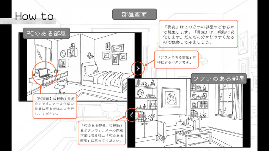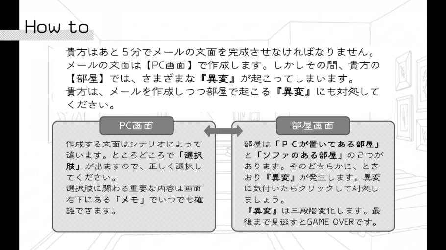 ☆ ノベルゲームコレクションで公開中 ☆ メールを出すのを忘れてた!あと5分で書かなきゃ・・・。 でも、この部屋たまに異変が起こるんだよね。 放置してると大変なことに・・・。 部屋に起こる『異変』を探しつつ『メール』も完成させよう。 ・・・5分で!! ------------------------------------- これは、『メール作成』と『異変探し』を並行して行うゲームです。 1プレイは最大5分。 メール作成画面では、メモを確認しながら 正しいと思う選択肢を選んでメールを完成させましょう。 メールを作成している間、部屋ではたまに異変が発生しています。 異変を放っておくとゲームオーバーになってしまいます。 異変が起きている箇所をクリックして異変を指摘しましょう。 ※背景が読み込まれず画面が真っ暗になる事がありますが、 それは異変ではなくバグです。申し訳ございません。 その際はリロードしていただきますようお願い申し上げます。 ◎異変の数 25箇所 ◎シナリオ数 6つ ※怖い表現はありませんので、安心してプレイしてください。 ※異変コンプリート+シナリオ制覇の目安は30分程度です。 下記サイトで公開中です。↓ https://novelgame.jp/games/show/12479