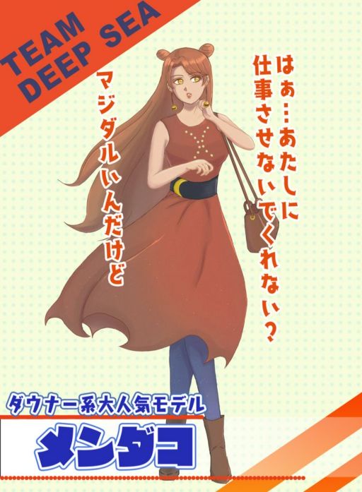 専門学校の課題で、メンダコを擬人化したキャラクターをデザインしました。メンダコの耳のような部分を髪型で、顔の模様を胸の装飾で、かわいらしい脚をスカート部分で表現しました。塗りは、グリザイユ画法とGtC塗りに挑戦してみました。スカートの裾やタイツにアクセントとして自作のブラシを使用したり、絵の上からノイズを貼り付けてテクスチャを変えたり等いつもより工夫して描いてみました。 制作期間:1ヶ月 使用ソフト:Photoshop、Illustrator(プレゼンボードの制作)