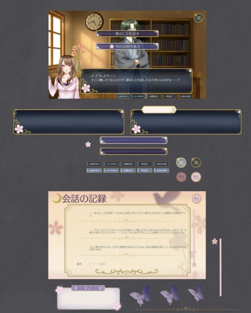 私が手掛けたゲームUIの一部です。 乙女ゲーム/RPGのジャンルで作らせて(組ませて)いただきました。 RPGの方は一部素材を使用させていただいておりますが、実装は自身で行いました。 乙女ゲームの方はUI作成&実装を全て自身で行っております。