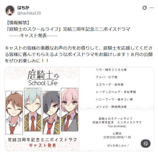 学園ファンタジー乙女RPG 『庭騎士のスクールライフ』 完結三周年記念ミニボイスドラマ 天才と謳われる庭騎士候補【リカ】を演じました 制作者:うえきばちFACTORY ▼ゲーム本編 https://plicy.net/GamePlay/150356 ※サンプル音声は作品公開後掲載します (2026年8月予定)