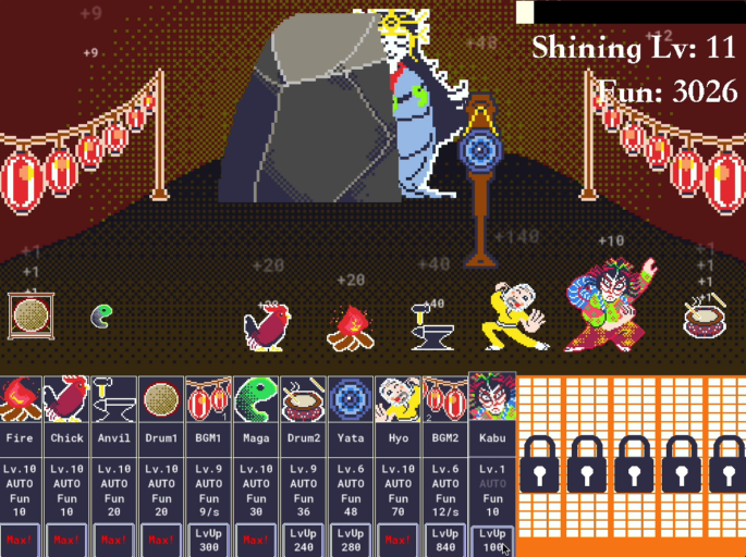神話がテーマのGameJam向けに作成しました。 企画・調査に3日、プログラムとバランス調整に2日、ドット絵製作やUI調整に2日ほどかけて1人で作成しました。 シンプルなクリッカーゲームで、ブラウザ上で無料プレイできます。 https://sparklewing.itch.io/amaterasu-in-the-dark