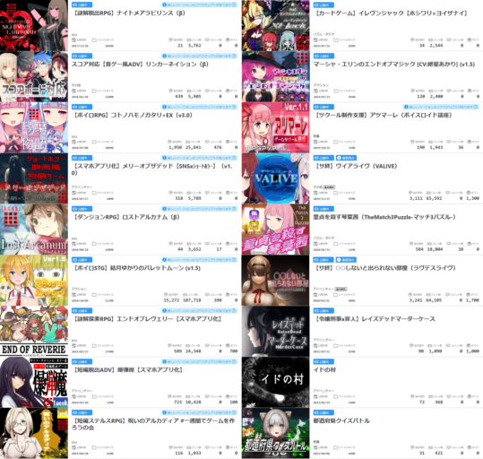都道府県クイズバトル(クイズゲーム) イドの村(ホラーADV) レイズデッドマーダーケース(サスペンスRPG) ラヴデスライヴ(ホラーADV) 童貞を●す琴葉茜(マッチ3パズル) ヴイアライヴ(ゲーム制作ADV) アツマーレ(制作支援風ゲーム) 太陽のレクエルド(護衛RPG) エンドオブマジック(アクション風ミニゲーム) イレヴンジャック(カードゲーム風) 呪いのアルカディア(ステルスRPG) 爆弾魔(ホラーADV) エンドオブレヴェリー(謎解きRPG) バレットムーン(シューティング) ロストアルカナム(ダンジョンRPG) メリーオブザデッド(ホラーADV) コトノハモノガタリ(二次創作RPG) リンカーネイション(音ゲー風ADV) ナイトメアラビリンス(謎解きRPG) ※アツマール閉鎖に伴い公開停止中がとほんどです ※画像のプレイ数等はアツマール閉鎖直前の統計です