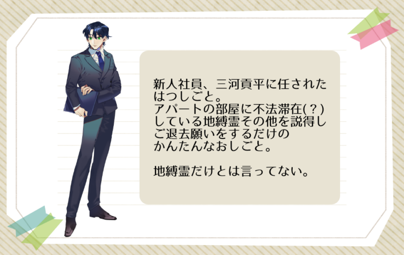制作ツール、ティラノビルダー 立ち絵のイメージを元にテーマ・ストーリーを考えたコミカルホラーノベルゲーム。 数箇所選択肢があり間違えると即バッドエンド、すぐに選択肢に戻れる仕様。 間違えた場合のノーマルエンド、すべて正解の真エンドあり。