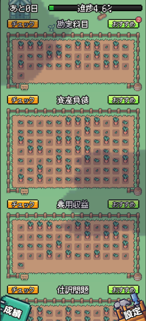 簿記3級向けの学習クイズアプリです。 正解の回数に応じて作物が育ちます。 https://play.google.com/store/apps/details?id=com.SurFun.FARM ポートフォリオを作成する為、作問以外を担当しました。 作問は友人に行ってもらったもので、 その他の資格にも対応できるようにExcelで編集可能にするなど工夫しています。