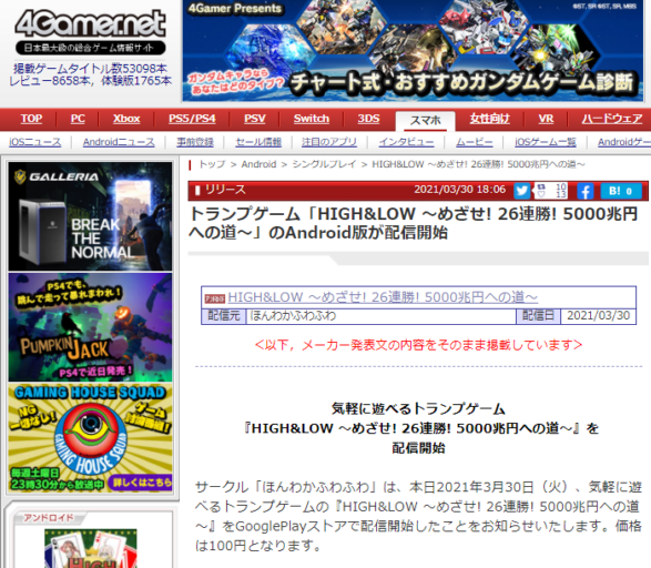 【ゲーム制作】HIGH&LOW ~めざせ! 26連勝! 5000兆円への道~【販売】