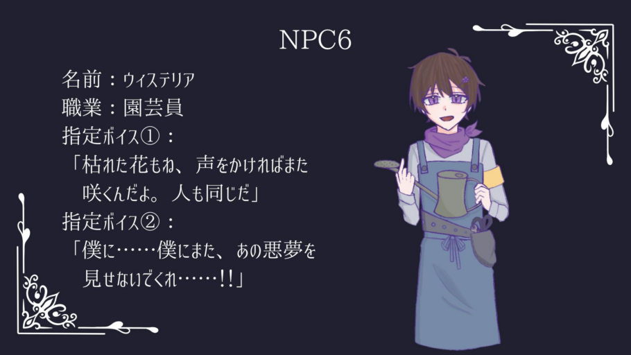 TRPG作品 『Never Ending Nightmare』 プロモーションムービーにて 優しい園芸家【ウィステリア】のCVを担当しました